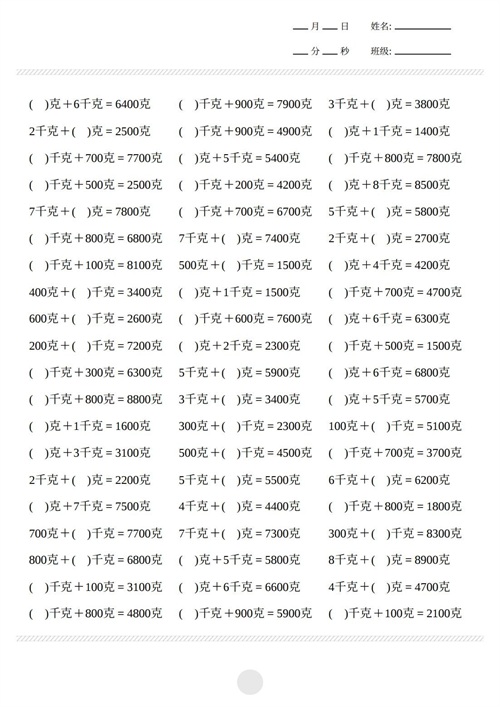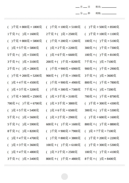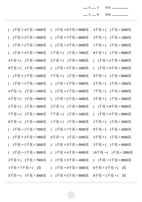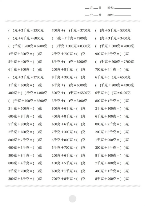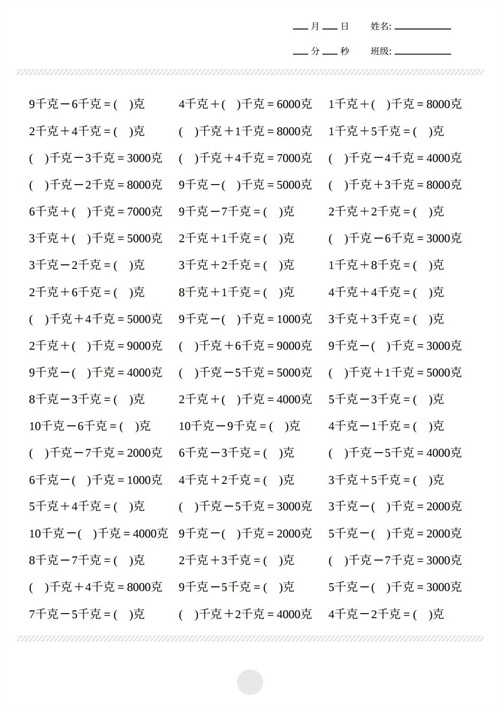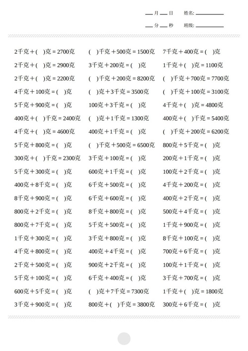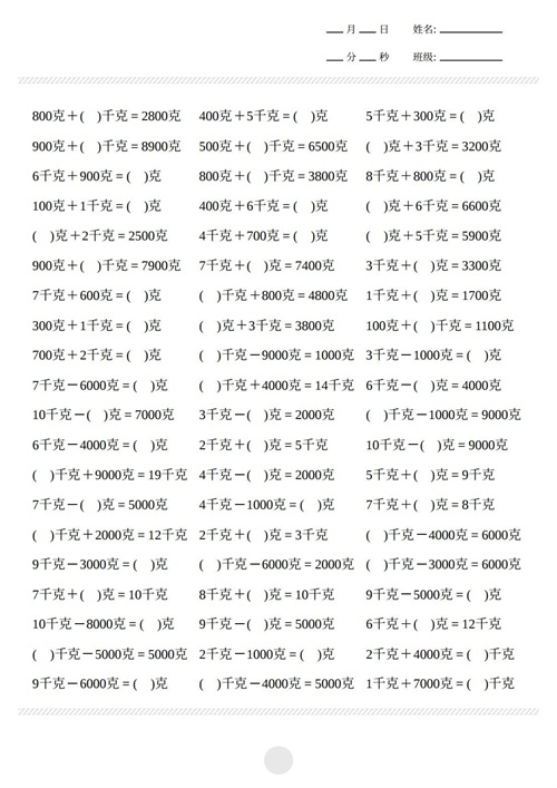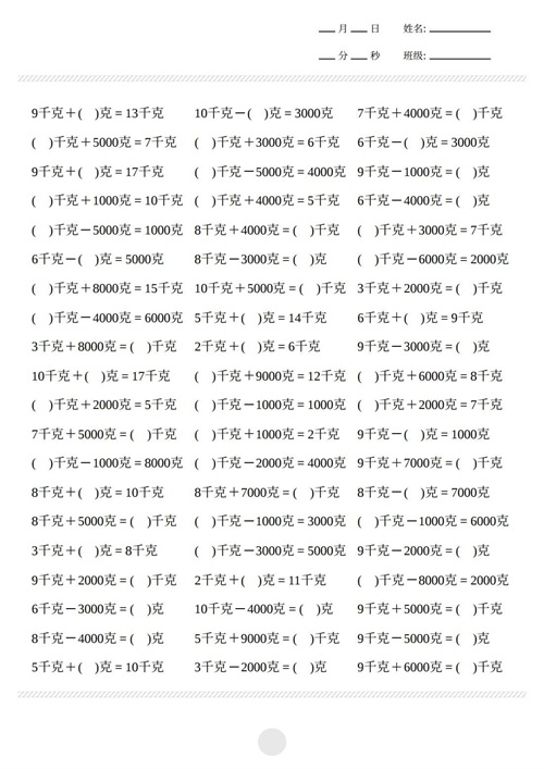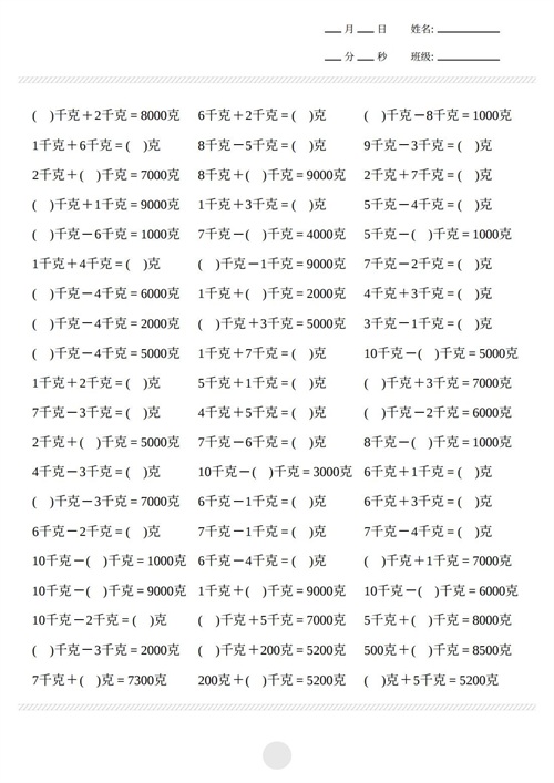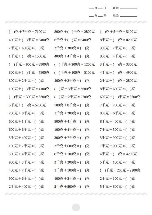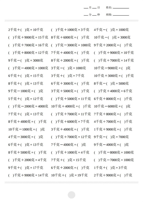 二年级数学克与千克之间的计算互换2000题,包含了最基础的课与千克之间的换算,能够做好这些计算题,就说明在学习克与千克这部分,计算能力相当好,最重要的是上面有日期,可以让孩子做限时训练,一天一页,非常锻炼孩子