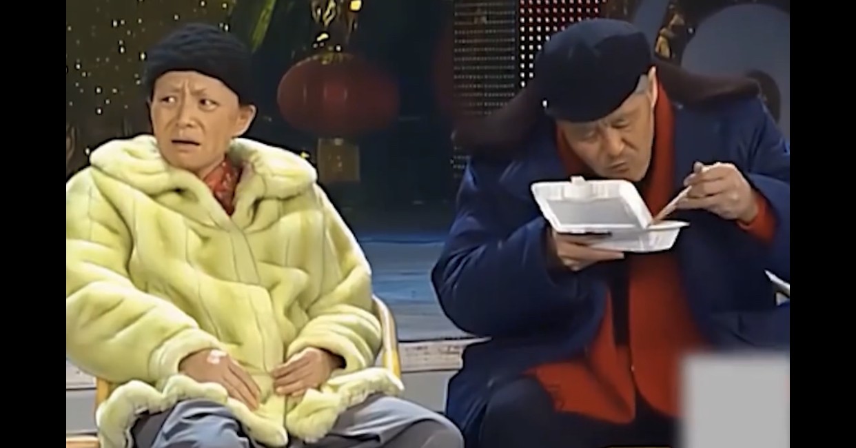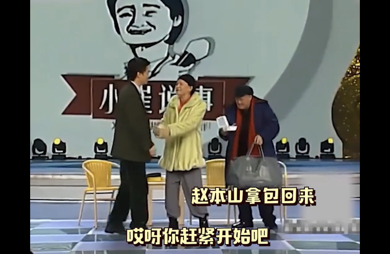 06年的《小崔说事》也同样打卡了名场面。本山大叔端着盒饭上台,一时忘记了自己的道具包。是准备将盒饭放进包里的时候,才发现道具包没有拿。