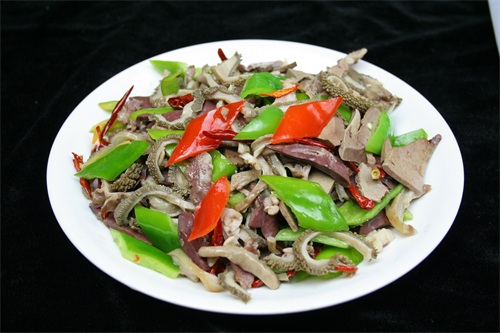 6、再加入适量的料酒、胡椒粉、盐,翻炒一会儿,放入青椒,继续翻炒到食材成熟入味;即可;