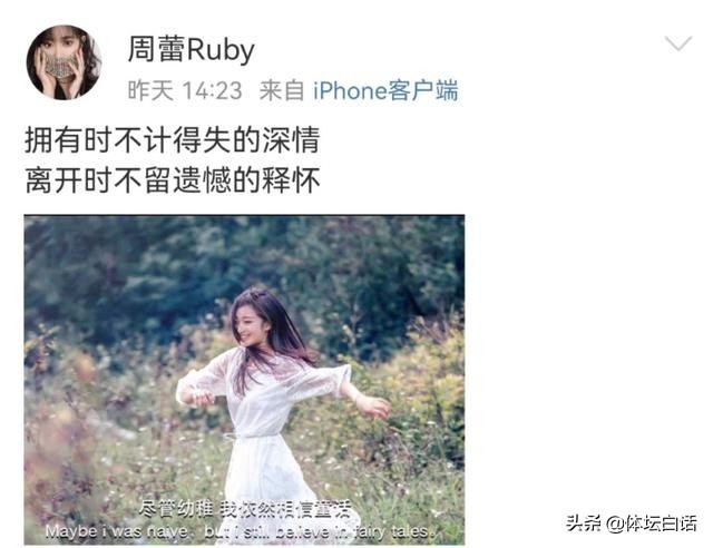 另外在近日,周蕾发布了一条略显消极的动态:“拥有时不计得失的深情,离开时不留遗憾的释怀”,配图是她一个人在充满花草的地方欢乐奔跑,字幕为:“尽管幼稚,我依然相信童话”,整体看上去,她的生活似乎出现了一些问题,许多网友也都纷纷关心其婚姻上是否出现了一些问题,周蕾没有回答,而是很快将动态删除了,这样的行为让人颇为疑惑。