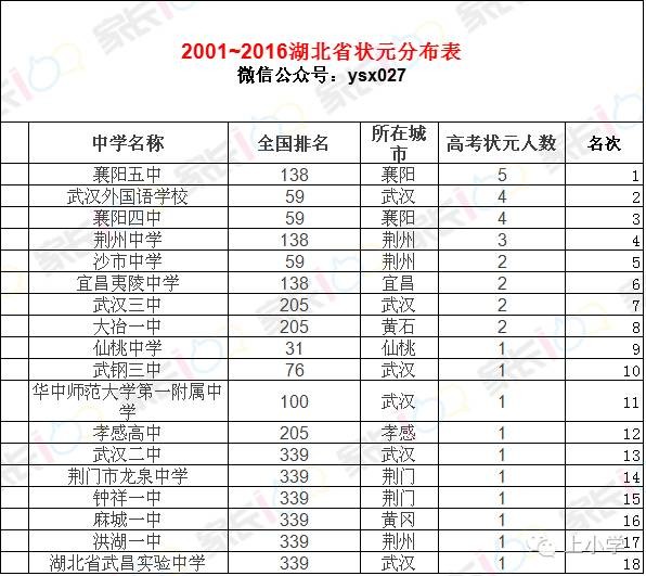 2001~2016年湖北省高考状元分布名单