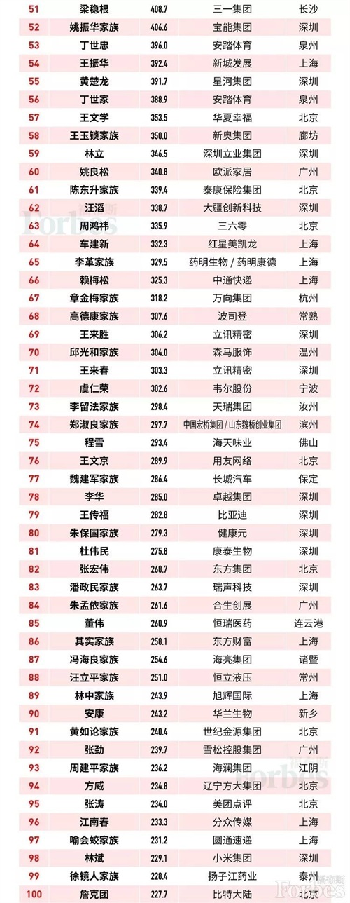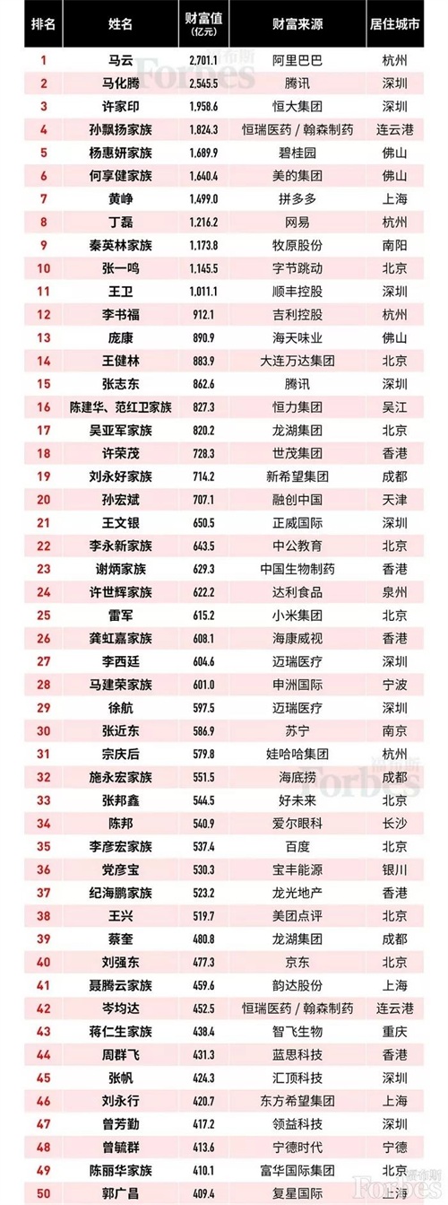 2019福布斯中国富豪榜单TOP100