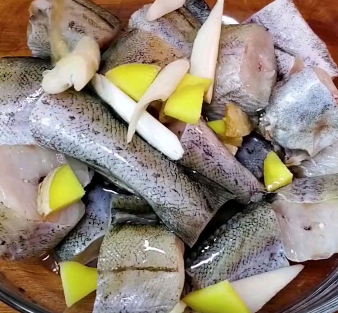 鳕鱼切大块,葱、姜切片,放入碗中。放入料酒,腌制十分钟。