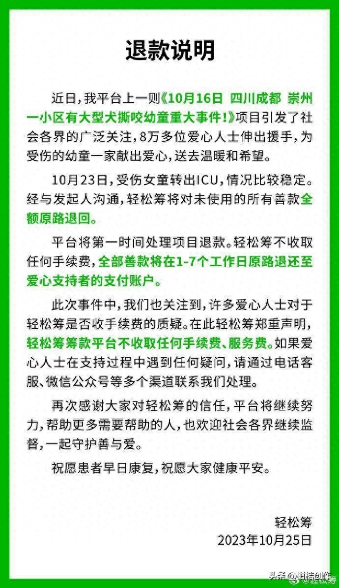 10月25日,@easilyraise微博发布退款声明称,10月23日,受伤女孩已从重症监护室转出,病情相对稳定。与赞助商沟通后,Easyraise 将全额退还所有未使用的捐款。回来了。