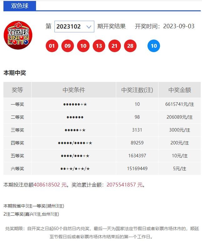 9月3日,双色球第2023102期开奖,全国共开出10注一等奖,单注奖金661万元,我省湖州购彩者中得其中3注,分别获得奖金665万元。