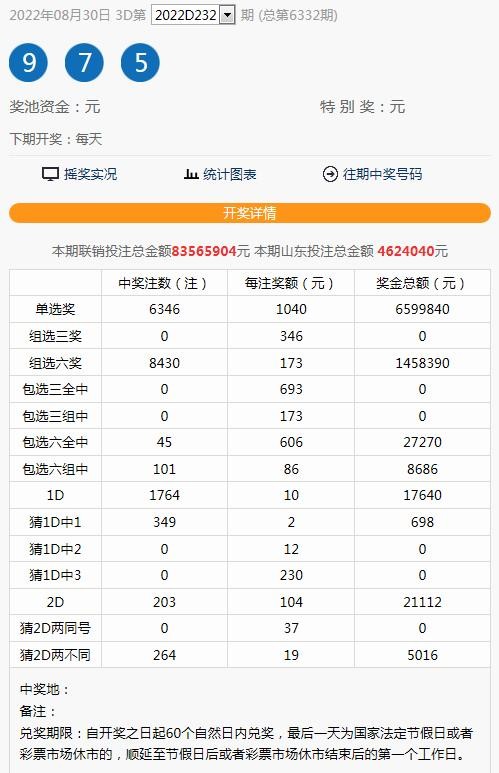 昨晚(8月30日)开奖的福彩3D第2022232期,开出中奖号码“9 7 5”,山东彩友喜获6346注单选奖、8430注组选六奖、45注包选六全中、101注包选六组中、1764注1D、349注猜1D中1、203注2D、264注猜2D两不同,本期山东投注总金额 4624040元,奖金总额高达8138652元,返奖率超过100%,达到176%。