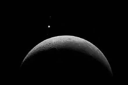 此时月球则是月龄3.5的眉月,亮度约-10.7等,比-1.8等的木星亮了3600多倍,不过好在木星也不暗,所以木星与月球接近的景象以肉眼就可以观察,利用双筒望远镜也可以将两者同时容纳在同一视野中。