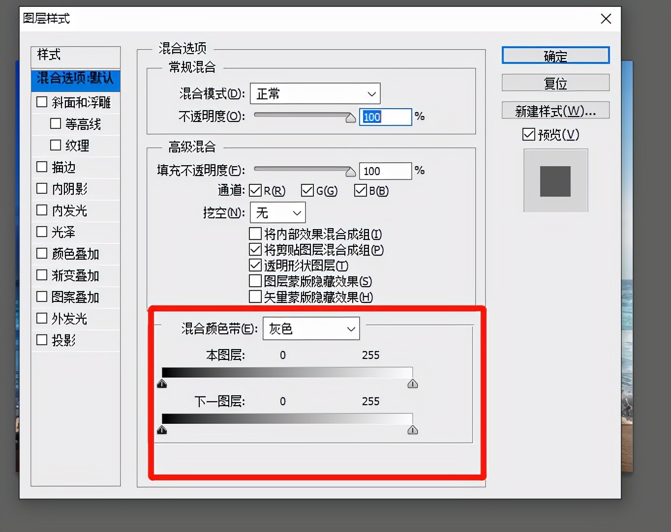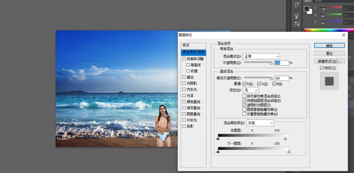 6.用鼠标点击混合选项,在其下方找到混合颜色带,通过调整本土层和下一图层的数据大小,使两张图更好地融合到一起。