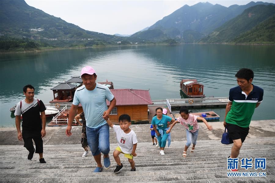 7月30日,游客在云阳龙缸国家地质公园清水湖乘船游览后上岸。