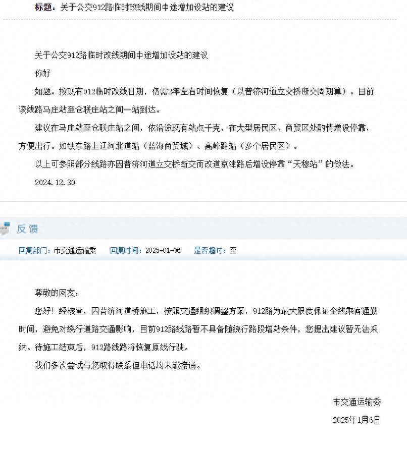 关于公交912路临时改线期间中途增加设站的建议 问题回复