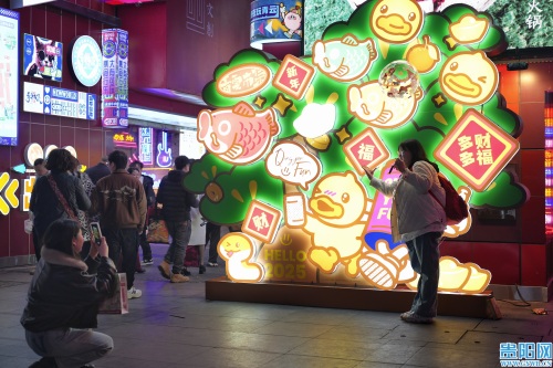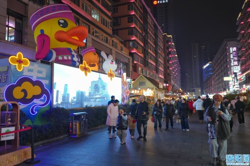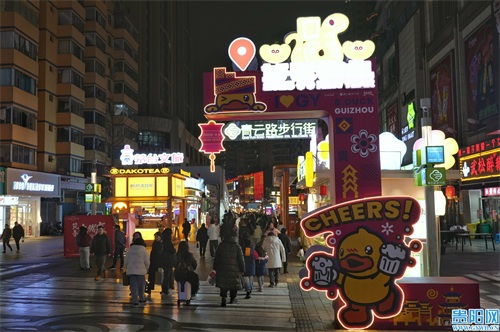 贵阳网·甲秀新闻讯 春节临近,南明区青云路步行街开展了以“蛇来运转 好巳发生”为主题的新春游园会,活动将持续到2月12日,包含新春游园(小黄鸭主题年货节、多彩新春市集、青云年货好物摊位),新春互动(集章纳福、打卡送“福”),新春盛会(醒狮迎春、嘘花舞龙、汉服巡游、歌手驻唱)等多彩活动,吸引不少消费者前来休闲购物,青云路步行街处处洋溢着热闹红火的节日氛围。