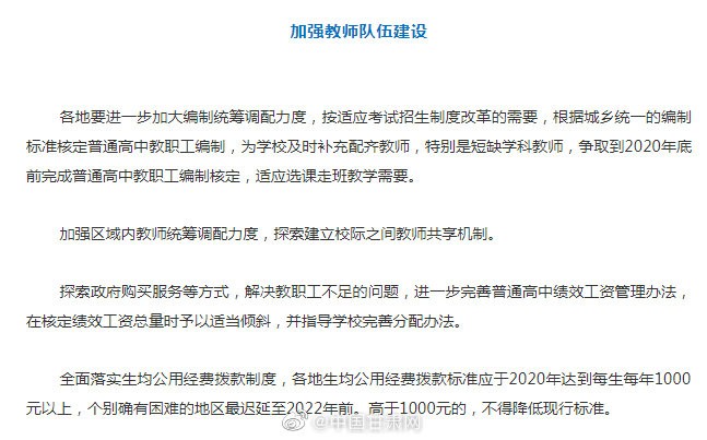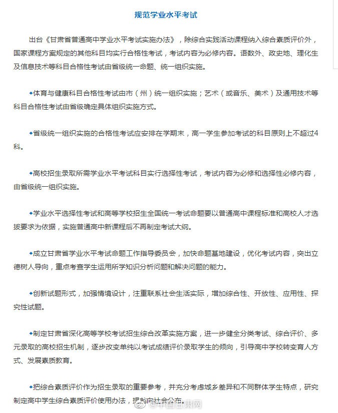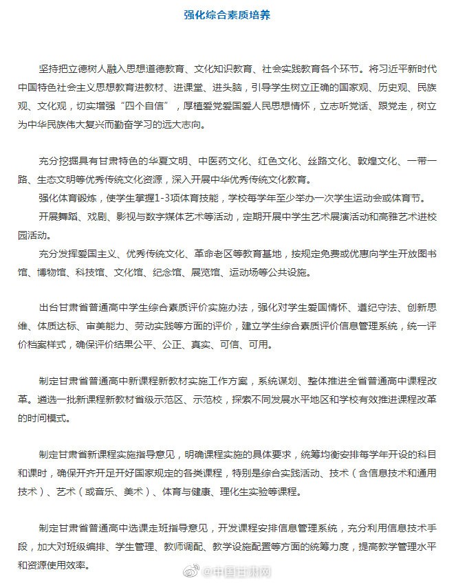 甘肃教育 【速看!甘肃2022年全面实施普通高中新课改】省教育厅、省人社厅等七部门日前出台的《关于新时代推进普通高中育人方式改革的实施意见》明确,到2022年,全面实施普通高中新课程新教材,深入推进适应学生全面而有个性发展的教育教学改革,进一步完善德智体美劳全面培养体系,健全立德树人落实机制和选课走班教学管理机制,基本建立起科学的教育评价和考试制度,师资和办学条件得到有效保障,普通高中多样化有特色发展的格局基本形成。