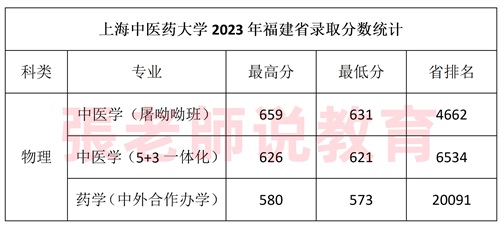 上海中医药大学2023年在福建省招生类型是普通类本科批,并且只招物理类高考生,其中录取最高分659(省排名1259),录取最低分573(省排名20091)。
