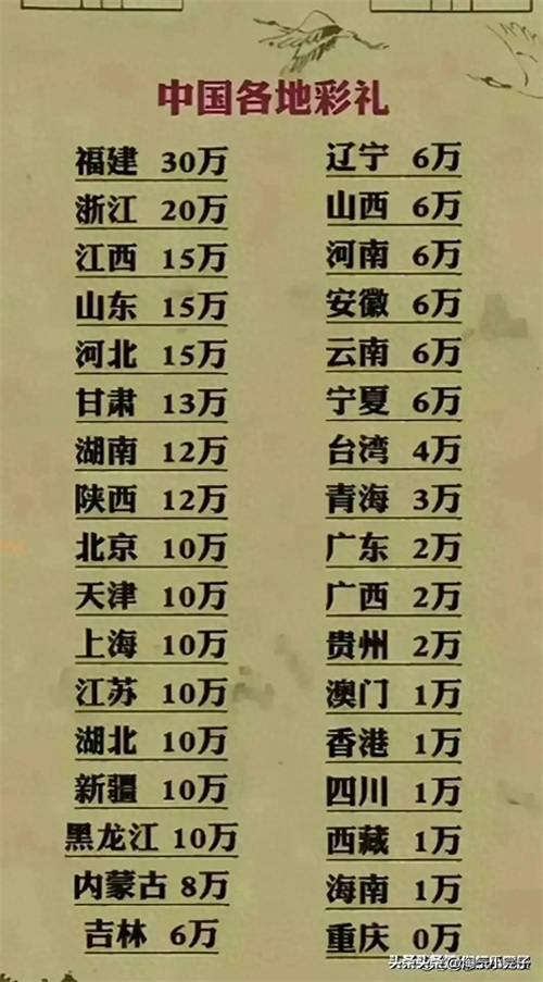终于有人把“中国各地彩礼”整理好了,对照一下,你那里有多少?