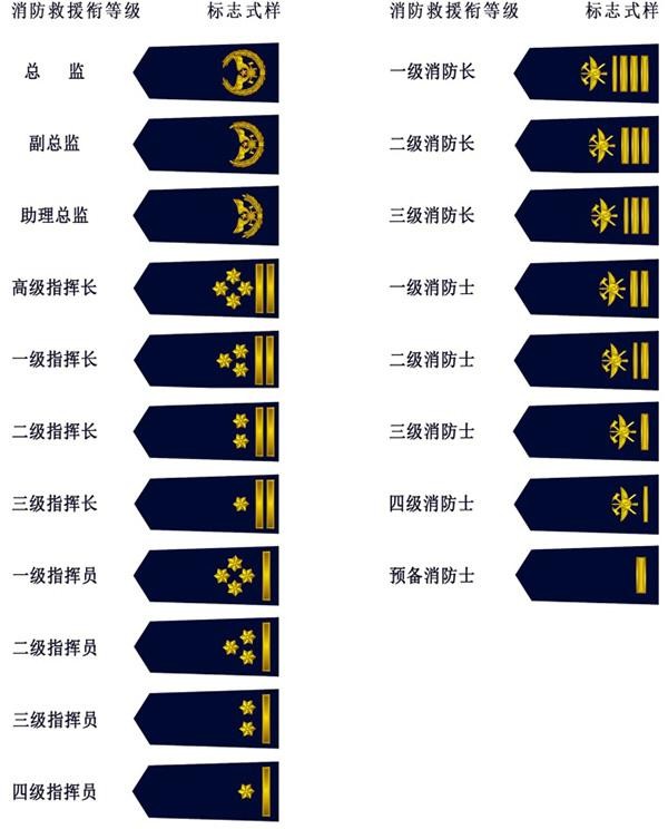 消防救援衔使用消防斧水枪等元素,六角星花和横杠等表示级别