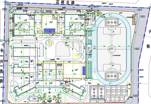 总平面图显示,该项目包括教学综合体、宿舍楼、食堂、400米田径运动场等。