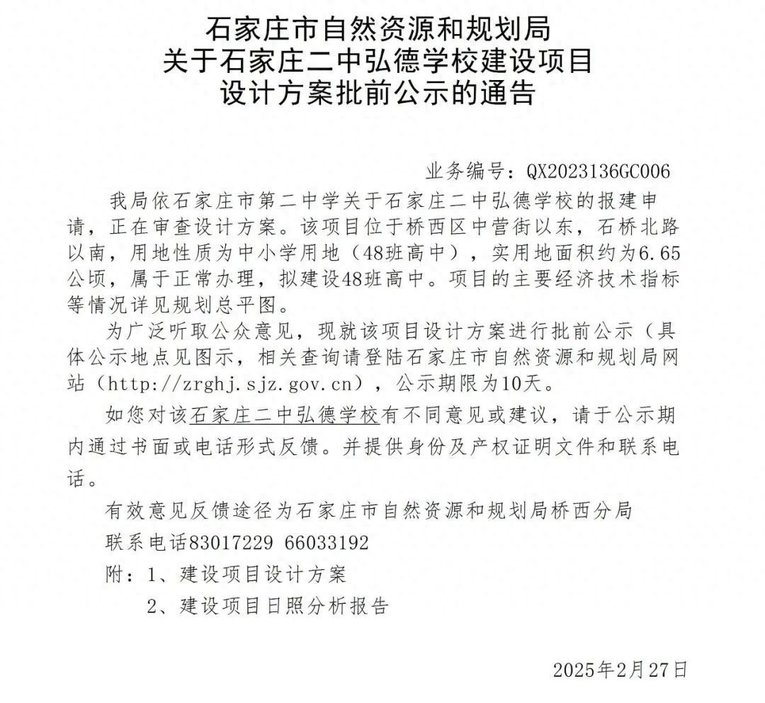 近日,记者从石家庄市自然资源和规划局网站获悉,石家庄二中弘德学校建设项目设计方案正在公示中。