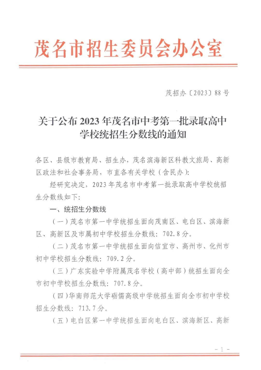 据茂名市招生委员会办公室7月15日消息,茂名市第一中学统招生面向茂南区、电白区、滨海新区、高新区及市属初中学校招生分数线为702.8分;招生面向信宜市、高州市、化州市初中学校招生分数线为709.2分。 广东实验中学附属茂名学校(高中部)统招生面向茂名市初中学校招生分数线为707.8分。华南师范大学砺儒高级中学统招生面向茂名市初中学校招生分数线为713.7分。高州中学统招生面向高州市初中学校招生分数线为726.8分。