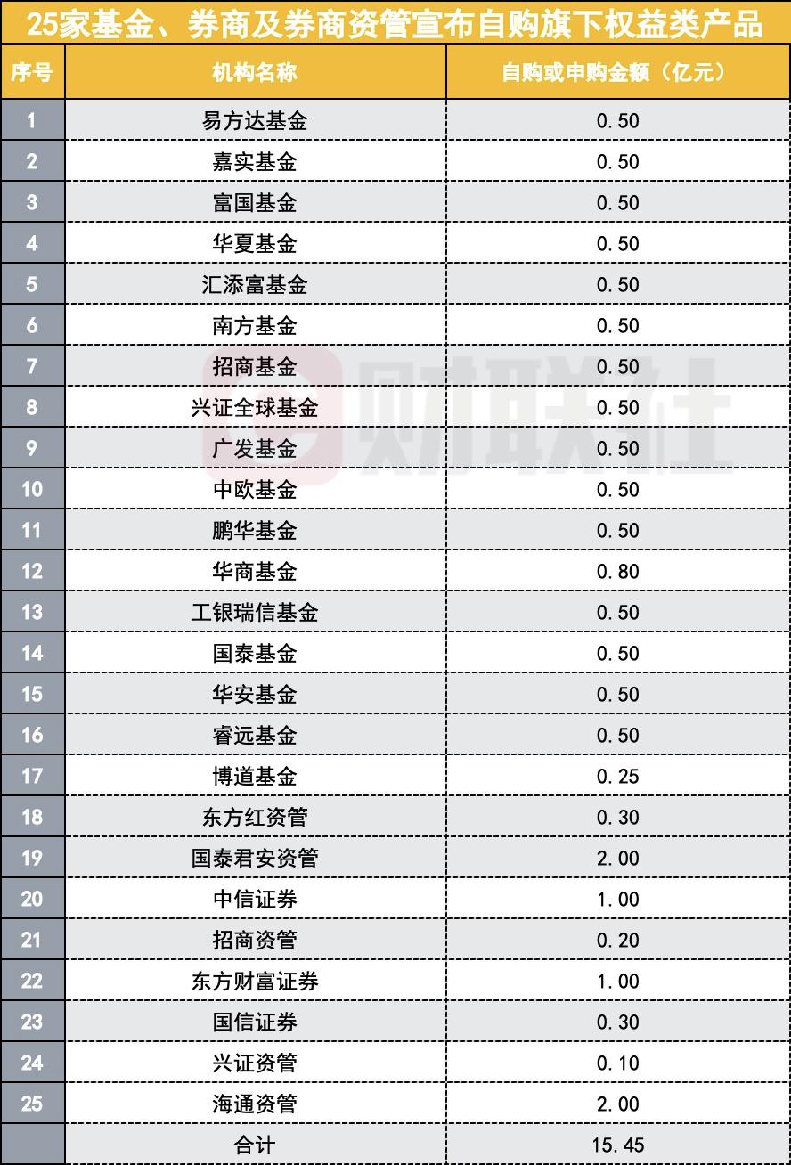 机构仍然热衷于自购,海通资管今日宣布拟自购 2 亿元。截至目前,已有 25 家券商或券商资管、基金公司密集出手自购,拟自购金额合计达 15.45 亿元。中信证券表示,机构自购潮对市场底部有一定的领先信号作用,过去四次市场底部均验证。
