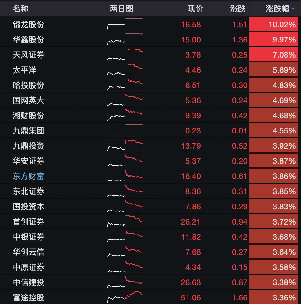 盘中,券商板块开始 " 跳水 ",走势逐渐分化。当日收盘,锦龙股份仍然封涨停板,华鑫股份涨 9.97%。多数券商个股盘中纷纷打开涨停板,股价下滑,东方财富涨幅从盘前 20% 回落至 3.86%,太平洋、湘财股份、华安证券、东北证券、国投资本、首创证券、中银证券、中原证券、中信建投等涨幅均低于 5%。