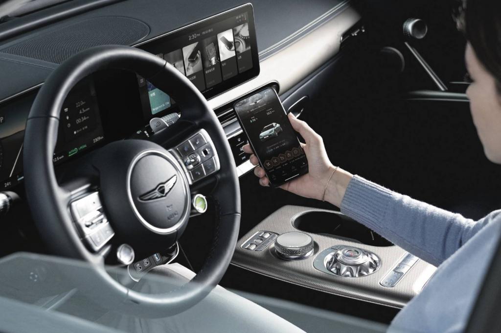 当然了,你也能用手机来解锁这辆捷尼赛思。GV60 在蓝牙和 NFC 的基础上,增加了延迟更低、安全性更高的 UWB 技术,手机距离 1-1.5 米,即可解锁车辆。