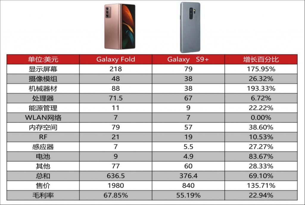 据 CGS-CIMB 的拆解统计,按比例计算,相较于高端直板机 Galaxy S9+,三星的折叠屏手机 Galaxy Fold 的成本就要高出不少,且集中在屏幕和机械器材(屏幕铰链)上,两者分别增长 175.95% 和 193.33%。
