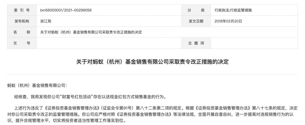 同样出于浙江监管局之后,早在 2025 年 3 月,蚂蚁基金已被查出旗下 " 财富号红包活动 " 存在以送现金红包方式销售基金的行为。由此,该局也决定对蚂蚁基金采取责令改正的监督管理措施,并要求公司全面开展自查自纠,进一步提高对违规销售行为的认识,提升合规管理水平,切实将投资者适当性管理工作落实到位。