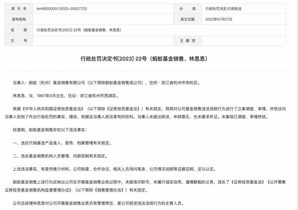据去年 7 月 7 日罚单披露,浙江监管局决定对蚂蚁基金及总经理林思思给予警告,并分别处以 7368 万元、15 万元罚款。