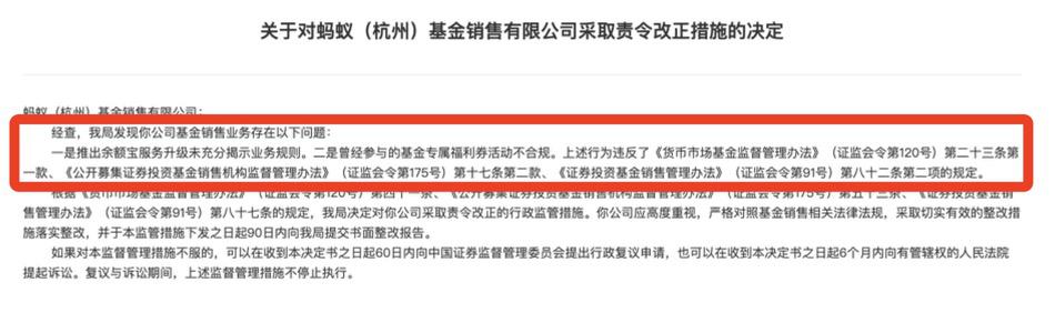 浙江监管局最新披露,决定对蚂蚁(杭州)基金销售有限公司(以下简称:蚂蚁基金)采取责令改正的行政监管措施,并要求公司应严格对照基金销售相关法律法规,采取切实有效的整改措施落实整改,并于该监管措施下发之日起 90 日内提交书面整改报告。处罚公告显示,蚂蚁基金存在两大违规问题:一是推出余额宝服务升级未充分揭示业务规则;二是曾经参与的基金专属福利券活动不合规。