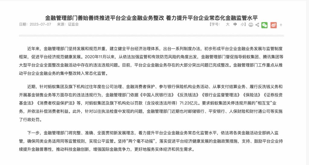 同一日,中国证监会官网发布要闻,指出针对蚂蚁集团及旗下机构过往年度在公司治理、金融消费者保护、参与银行保险机构业务活动、从事支付结算业务、履行反洗钱义务和开展基金销售业务等方面存在的违法违规行为,决定对蚂蚁集团及旗下机构处以罚款(含没收违法所得)71.23 亿元,并要求蚂蚁集团关停违规开展的 " 相互宝 " 业务,并依法补偿消费者利益。