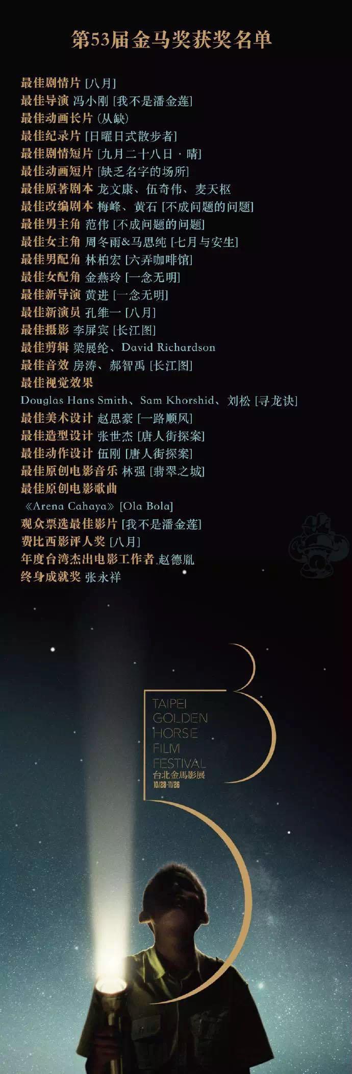 第53届金马奖颁奖典礼于2016年11月26日晚在台北举行,最佳剧情片、最佳男女主角等24个奖项悉数揭晓。