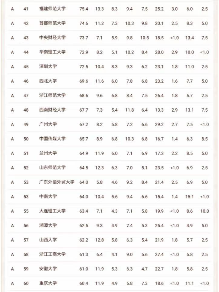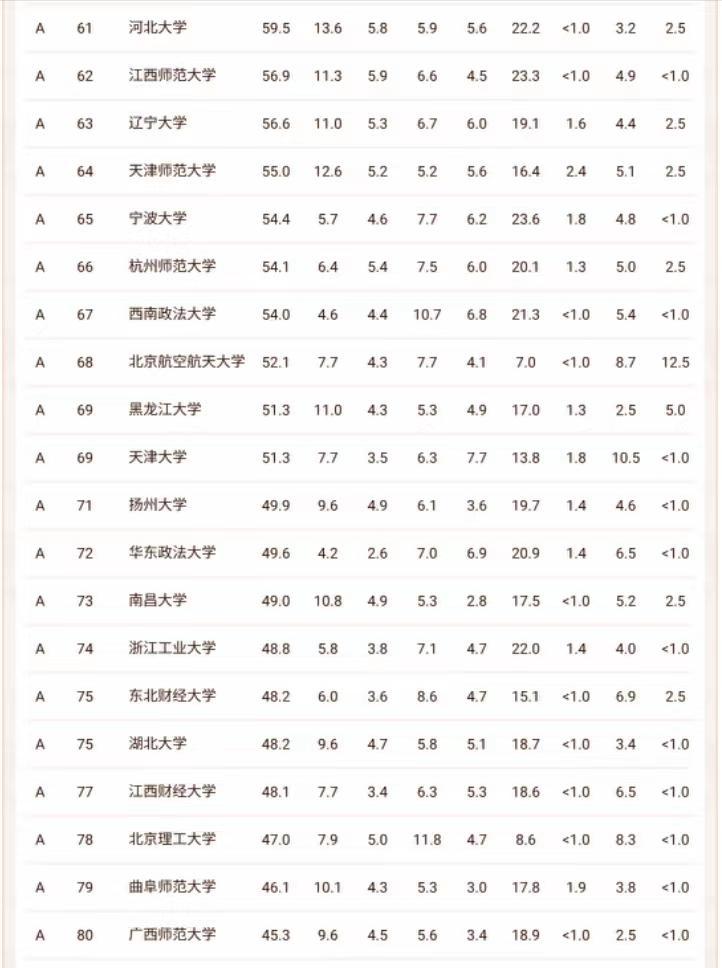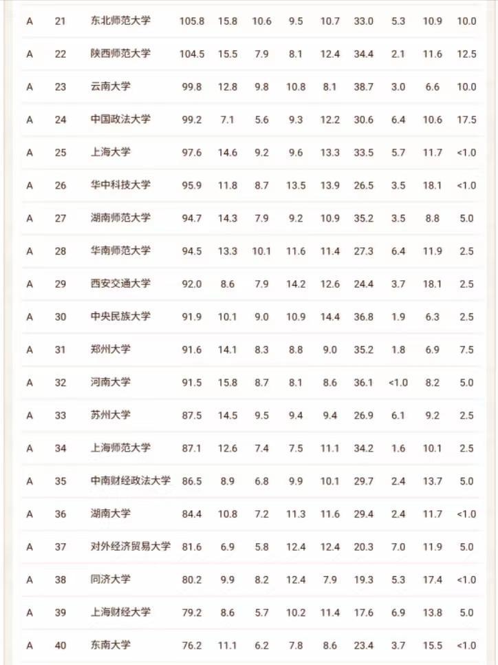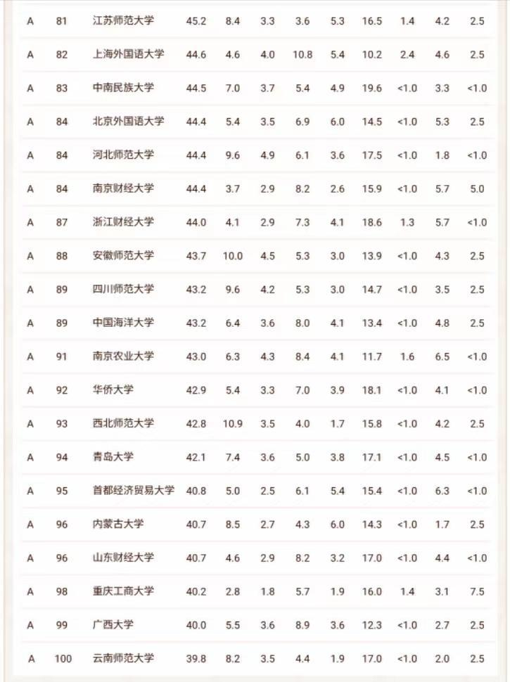 此外,上榜的100所高校有20所高校获得A+评分,是我国文科实力最强的一批大学。80所高校获得A评分,居高校文科实力第二档次。