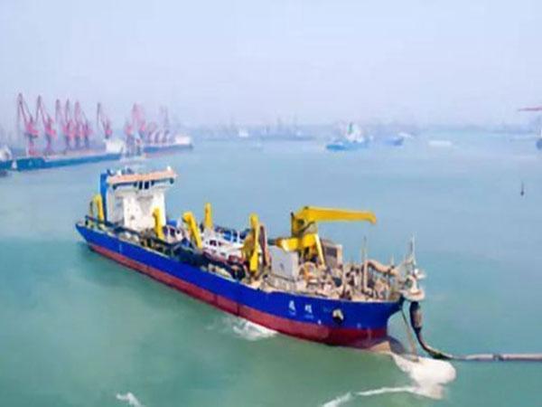 这艘船一个小时可以疏浚两万方的泥土,航行到指定的区域以后,可以通过吹填管线的连接方式,把它送到我们需要填海造陆或者造岛的区域。