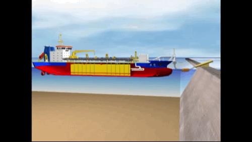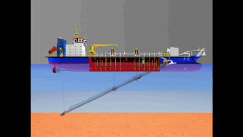 耙吸挖泥船,它将两只耙臂像手臂一样地伸在海底,最大的深度可以挖到90米,将泥沙从海底通过泥泵及耙臂上的一套水下泵把泥沙吸到泥舱里。