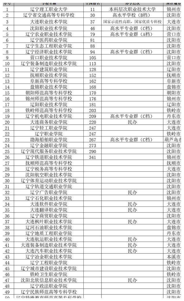 辽宁省当前职业院校共52所,排名最高的是辽宁省交通高等专科学校。设有一所本科层次职业大学,辽宁理工职业大学,位于锦州市,该校今年本科招生遇冷,这样的新形态学校,我们让他生长一段时间。