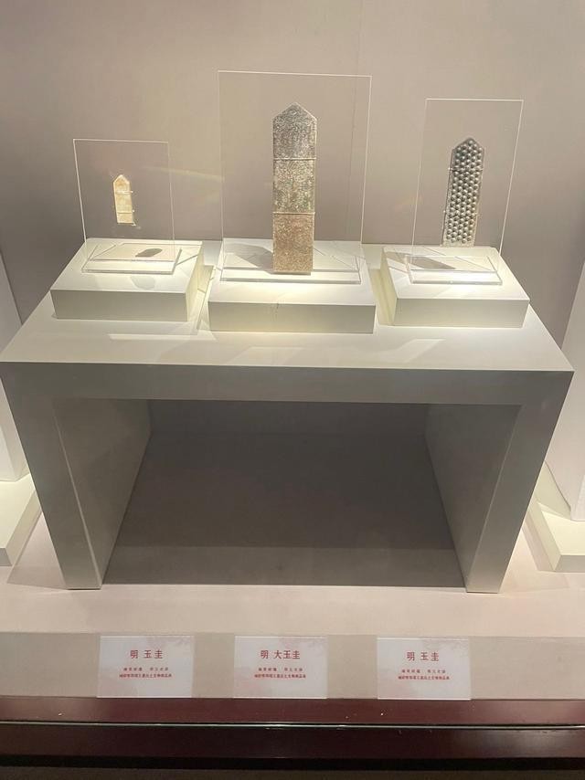 钟祥明郢靖王墓出土玉器。素面大玉圭(中间)谷纹玉圭(右)。见习记者包孟 摄