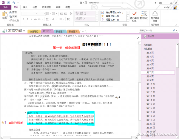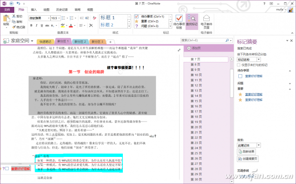 然后在弹出的窗口中选择一个OneNote分区存放输出的PDF文件,启动OneNote后会自动打开上述导出的书籍,现在就可以在页面上任意位置插入你的读书笔记了,比如某个章节自己觉得比较重要,则切换到“开始”,然后点击右侧菜单上的“重要”按钮,添加上标记字符,切换到“绘图”,则可以使用画笔任意进行标记(图2)。