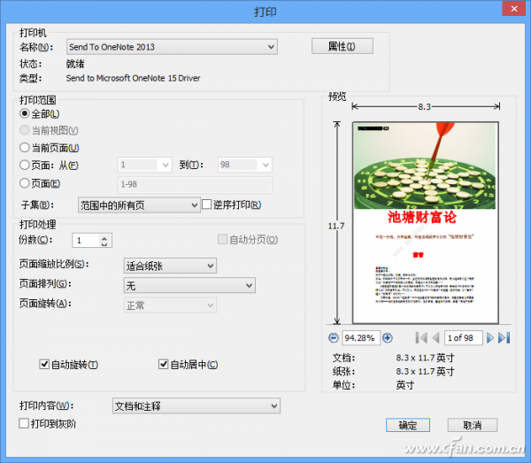 首先在平板上使用“福昕阅读器”打开需要阅读的PDF书籍(注意:由于Windows 8已经内置PDF阅读器,不要直接双击PDF文件打开),接着点击“文件→打印”,然后打印机名称选择“Send to OnteNote”,点击“确定”,将其发送到OneNote(图1)。