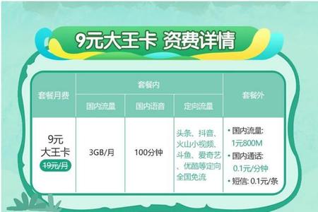 前段时间,电信推出了“9元大王卡”,可以在网上申请办理,月租为9元,套餐内包含了全国3GB的流量,100分钟语音通话。套餐外流量1元800M,语音通话0.1元/分钟。(大家可以与移动的8元保号套餐进行对比),详情如下图所示▼。