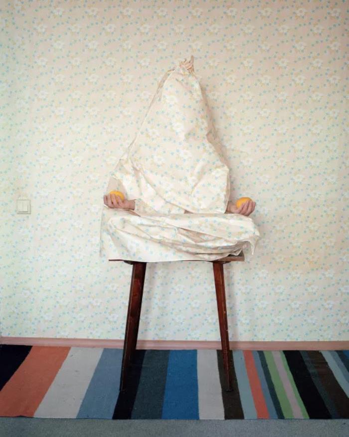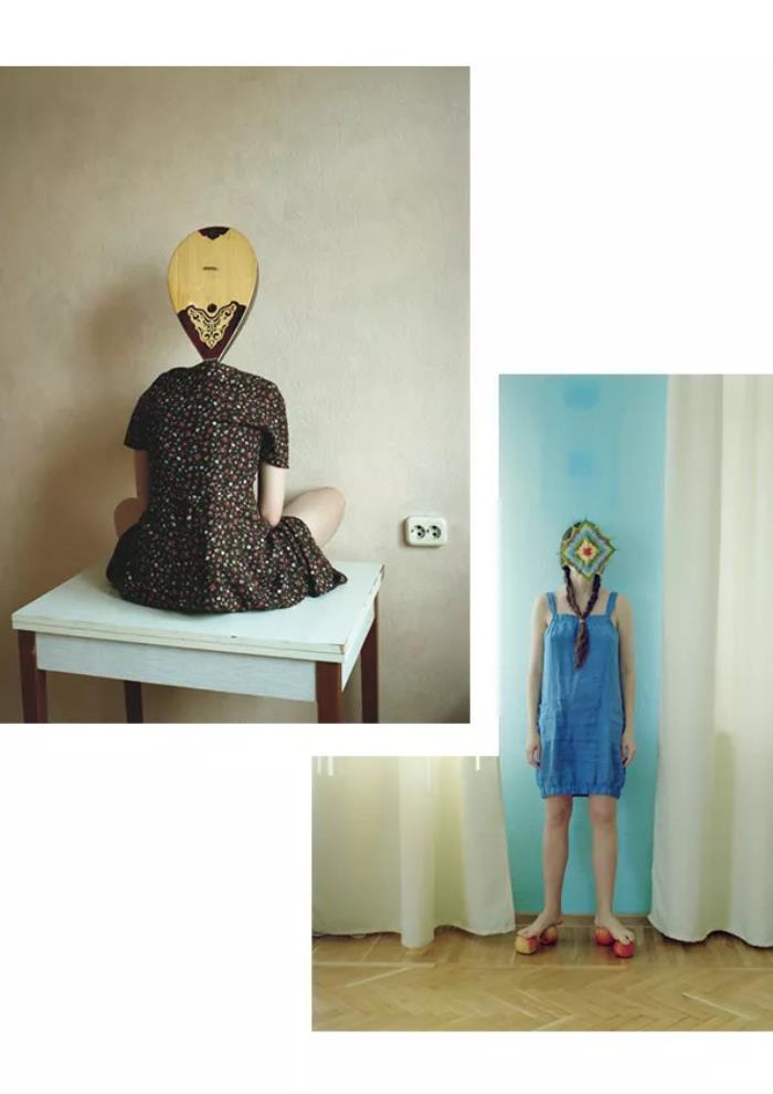 她镜头下的女孩打破了传统肖像的条条框框,个个都以物蔽其首,画面中混着各种图形和颜色,与背景巧妙地融为一体。