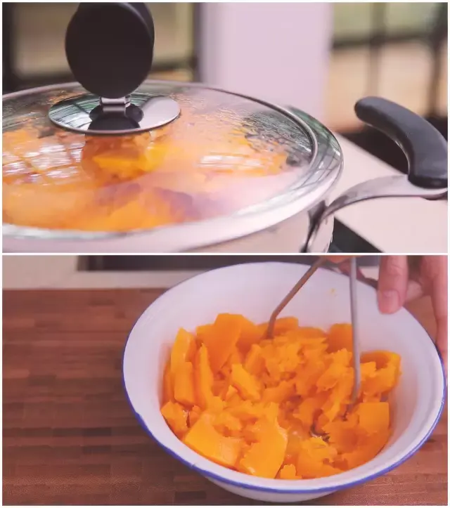 取熟透的南瓜,去皮去籽去筋,然后切成薄片,隔水用大火蒸熟。