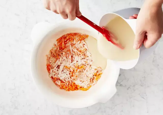 用过滤网滤出果汁,加入到面粉中,和成红色面团。