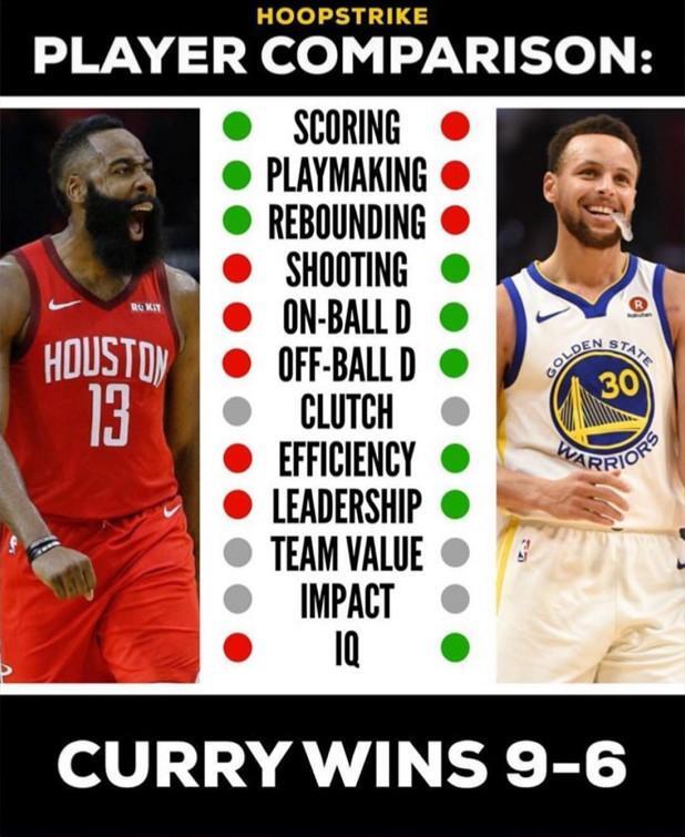 综上所述,在库里与哈登的12项能力对比中,库里6胜,哈登3胜,3项平局。整体上来说可谓是库里明显占优,那么对于美媒给出的对比结果,不知各位看官有何见解呢?