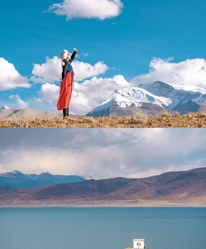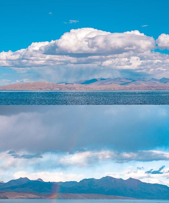 玛旁雍错的湖水像海水一样湛蓝,从眼前一路铺展至天边,与天际线处的岗仁波齐相接。 这种神山、圣湖的组合,是西藏湖泊常见的组合形式。