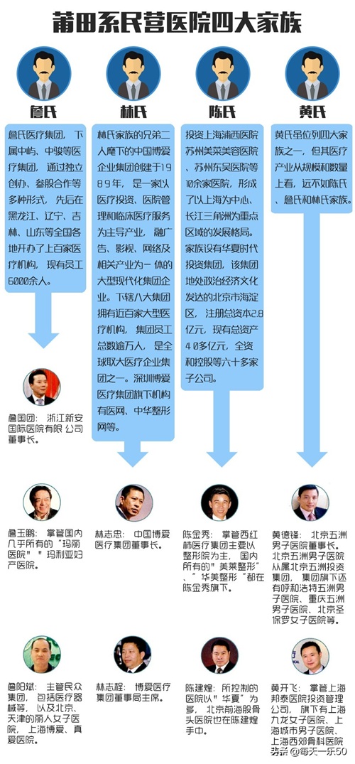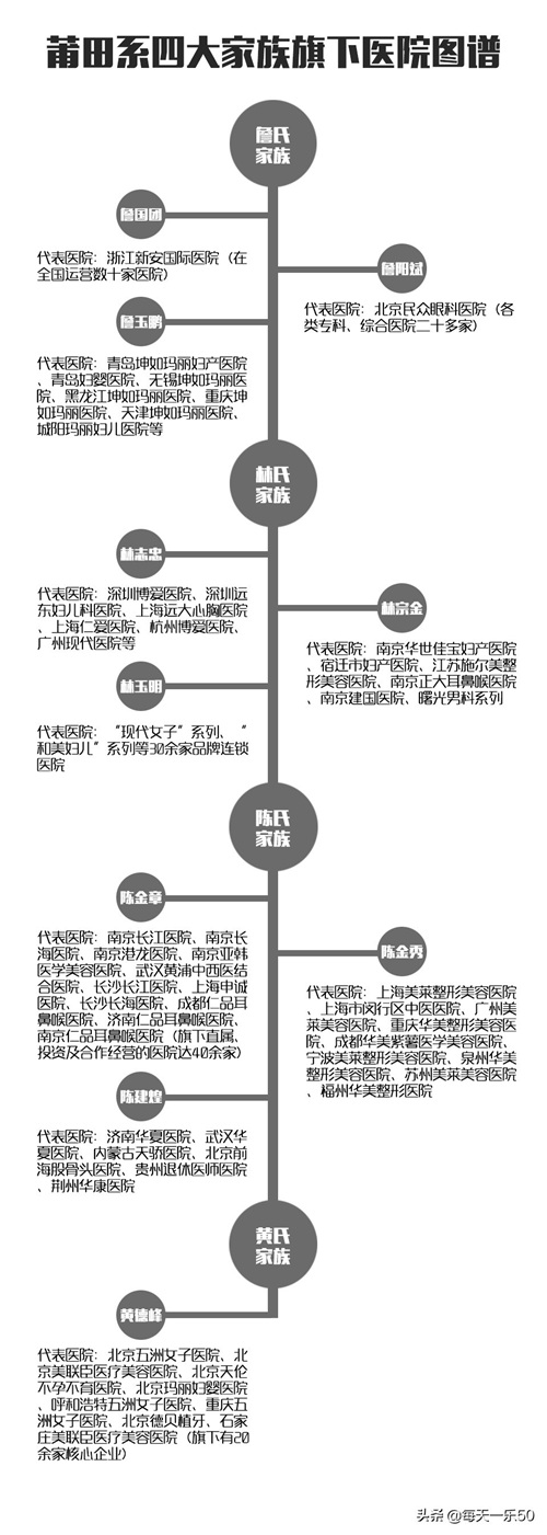 莆田系已形成四大家族:陈、詹、林、黄。80年代,“带头大哥”陈德良带八个徒弟出去,侄子詹国团、邻居陈金秀、镇党委书记的儿子林志忠,以及“徒弟的徒弟”黄德峰,这是“四大家族”由来。