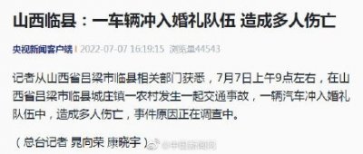 - 山西吕梁一车辆冲入婚礼队伍致多人伤亡 记者从山西省吕梁市临县相关部门获悉,7月7日上午9点左右,在山西省吕梁市临县城庄镇一农村发生一起交通事故,一辆汽车冲入婚礼队伍中,...