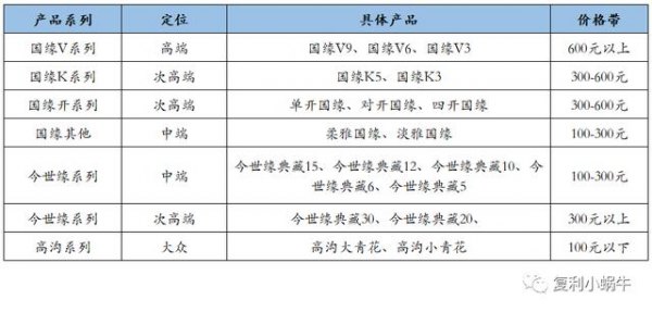 国缘系列:国缘V系列定位高端,其中V9清雅酱香型白酒定位“酱香新经典”,主要用于拉升品牌高度,V6定位高端带补充,V3定位高位次高端。