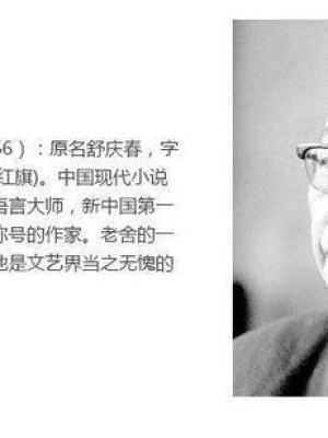 老舍(1899年2月3日—1966年8月24日),原名舒庆春,另有笔名絜青、鸿来、非我等,字舍予。因为老舍生于阴历立春,父母为他取名“庆春”,大概含有庆贺春来、前景美好之意。上学后,自己更名为舒舍予,含有“舍弃自我”,亦即“忘我”的意思。信仰基督教,北京满族正红旗人。 中国现代小说家、著名光荣称号作家,杰出的语言大师、人民艺术家,新中国第一位获得“人民艺术家”称号的作家。代表作有《骆驼祥子》、《四世同堂》、剧本《茶馆》。老舍的一生,总是忘我地工作,他是文艺界当之无愧的“劳动模范”。1966年,由于受到文革中恶毒的攻击和迫害,老舍被逼无奈之下含冤自沉于北京太平湖。