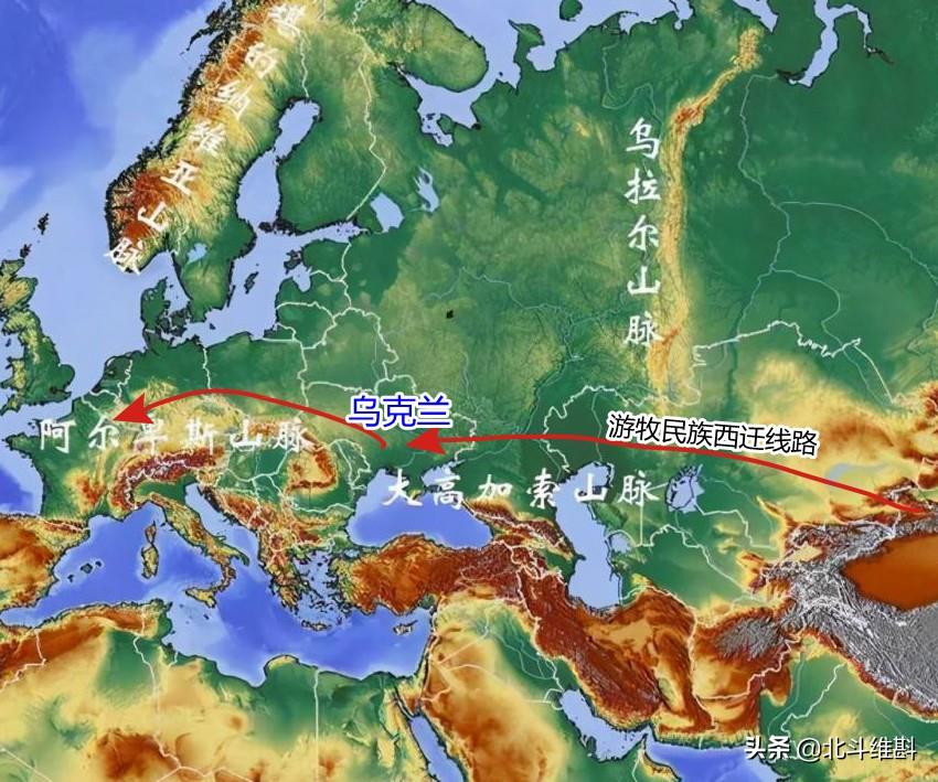 这是从南北商业交流的角度来看乌克兰。从东西方的角度来看,乌克兰处于黑海北岸,是古代东方游牧民族西迁到欧洲的必经之地,历史上的斯基泰人、匈人、柔然人、突厥人、蒙古人等都从这里进入进入中欧地区。