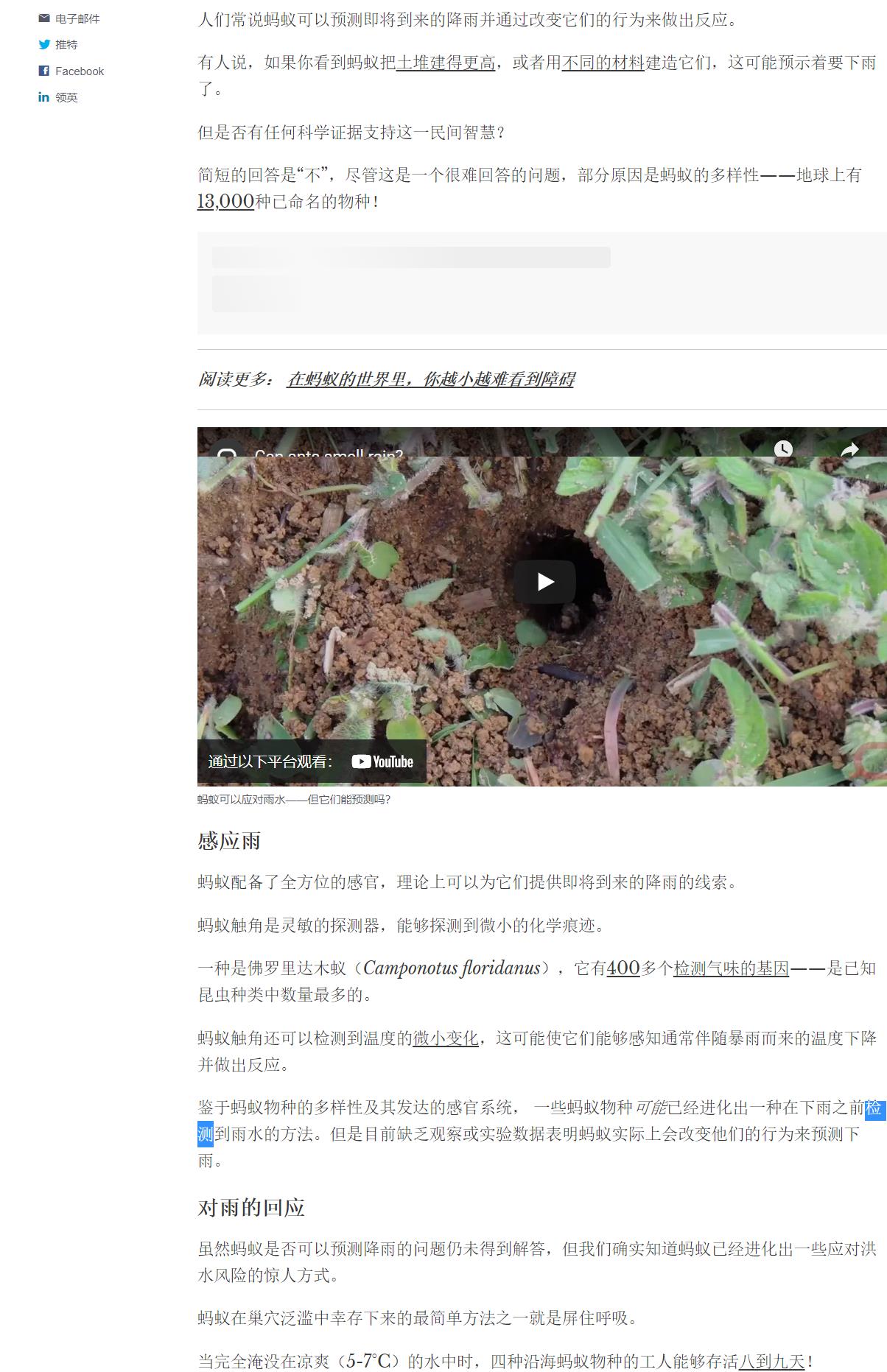 另外,非营利性新闻机构The Conversation上发表的一篇专门科普,名字就叫“我们有应用程序和雷达——但蚂蚁能预测下雨吗?”